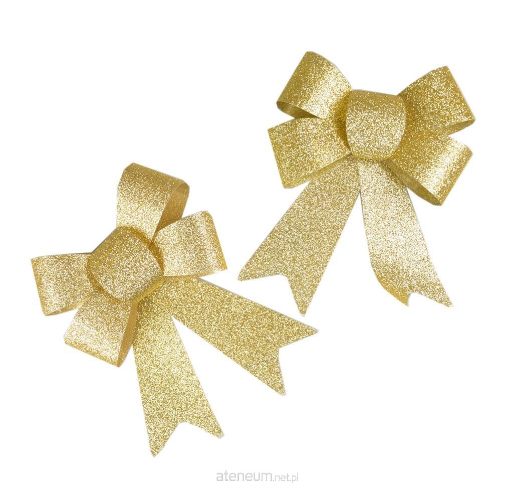Zestaw dwóch kokard dekoracyjnych w kolorze złotym. Produkt wykończony brokatowym zdobieniem - pięknie mieni się w świetle. Idealnie sprawdzi się w kompozycjach dekoracyjnych, świątecznych jak i do dekoracji prezentów. Wymiary jednej kokardy to 13,5x17,5 cm.