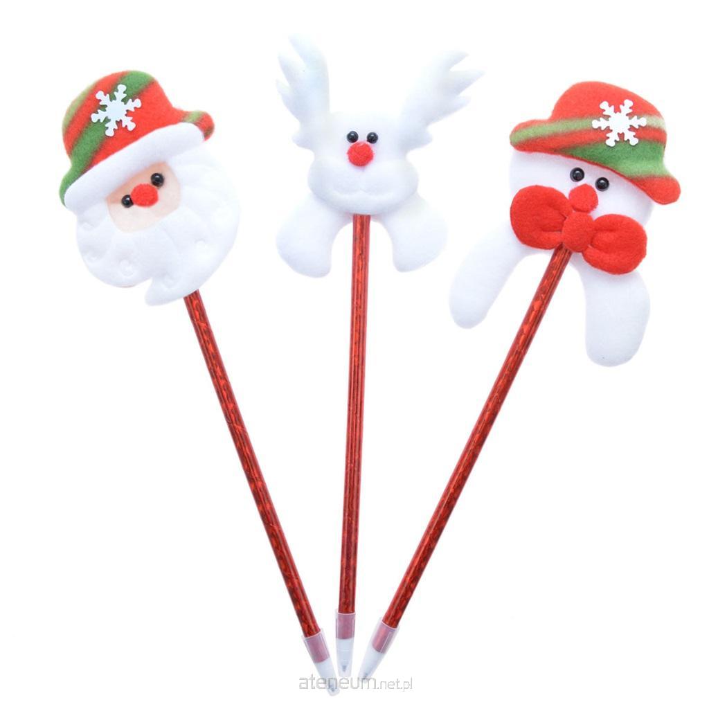 Długopis 20 cm z zatyczką i z ozdobnym świątecznym motywem na końcu - gumką do gumowania lub materiałowym Mikołajem bądź bałwanem. Kolor wkładu niebieski. W opakowaniu zbiorczym 24szt.