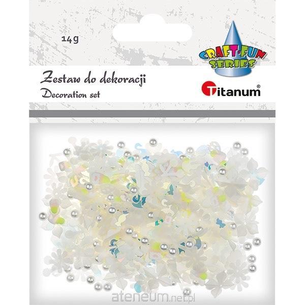 Zestaw perełki 4 mm, cekiny kwiatek płaski 10 mm, kwiatki wypukłe 2 wzory 10 mm, konfetti truskawka 5 x 7 mm, czereśnie 10 x 9 mm, nuta 6 x 9 mm, łabędź 6 x 8 mm, cukierek 8 x 3 mm, owca 12 x 11 mm, avocado dwustronne 5 x 6, 6 x 8 mm 14 g tonacja biała.
