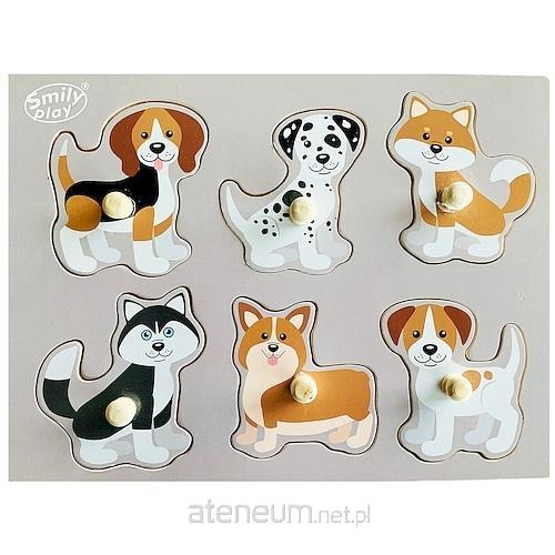 Każdy element tablicy jest w innym kształcie i kolorze puzzle prezentują różne rasy psów.