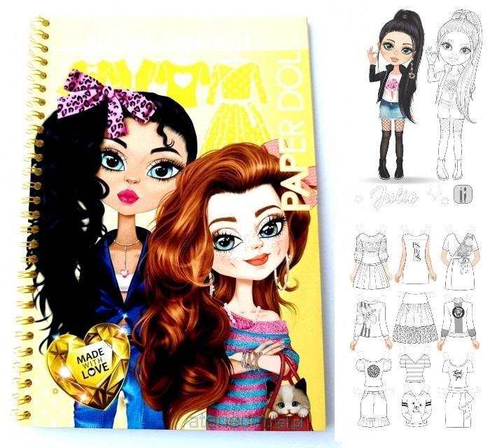Papierowe lalki do zabawy. W środku znajdują się dwie modelki, które można ubrać w wycięte i pokolorowane przez siebie stroje. Wytnij je z książeczki, potem ubierz - zaginając specjalnie wystające kawałki papieru. Lalki i kostiumy mają wyraźne oznaczenia pokazujące, gdzie wyciąć, aby ubrania pasowały do lalek. Baw się nimi opowiadając najróżniejsze historie. Potem możesz przebrać lalkę i zacząć zabawę od nowa. Oprawa: spirala, wyprodukowano na Ukrainie.