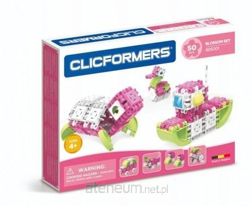 Zestaw zawiera: 10 klocków CLICFORMERS białych 10 klocków CLICFORMERS ciemno-różowych 2 klocki sześciokątne białe 2 klocki łuki zielone 4 trójkątne klocki zielone 4 białe kółka 2 osie 2 żółte daszki 2 żółte półkola 12 zaślepek białych 2 patyczki do otwierania