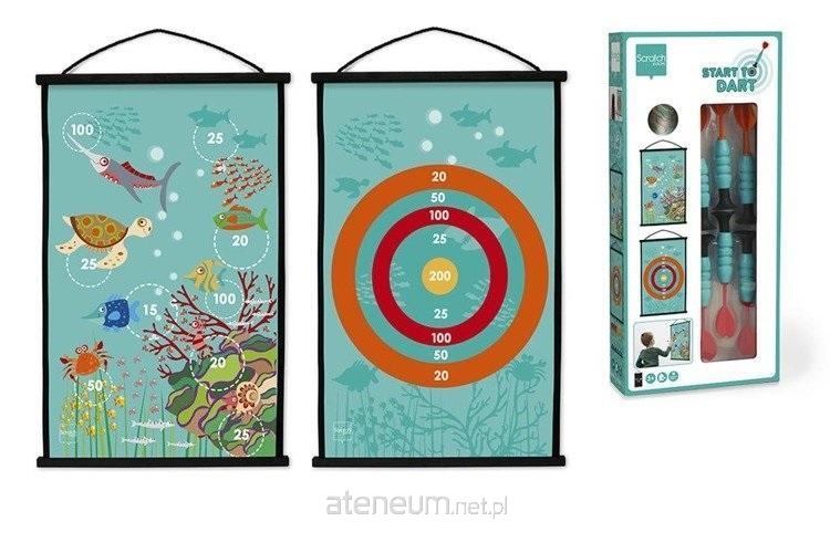 START TO DART _ RAFA KORALOWA - dwustronna tarcza z rzutkami z motywem Rafy Koralowej. START TO DART - to bezpieczna zabawa dla młodszych wielbicieli rzutek. Gra polega na jak najbardziej precyzyjnym trafieniu rzutkami w tarczę, gdzie rozmieszczono punkty za każdy oddany rzut. Tarcza jest dwustronna co pozwala na zabawę na dwa różne sposoby. Do tarczy dołączono 6 sztuk bezpiecznych rzutek z gumową przyssawką. Dzięki temu rzutki mają odpowiednie wykończenie bezpieczne dla młodszych dzieci, które rozpoczynają zabawę w popularną grę w dart. Dart to znana i lubiana gra, która rozwija zręczność i koordynację ruchowo-wzrokową u dzieci.
