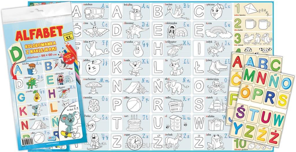 Dzięki składanej kolorowance "Alfabet" dzieci mogą zapoznać się z literami polskiego alfabetu oraz nauczyć się poprawnej kolejności alfabetycznej. Zestaw składa się z arkusza XL oraz 32 naklejek z drukowanymi, wielkimi literami. Naklejki można wkleić w wyznaczonych miejscach, obok obrazków do pokolorowania, których nazwy zaczynają się na daną literę (np. A jak autobus) lub ją zawierają (np. Ę w słowie gęś). Obok obrazków umieszczono także wielkie i małe litery pisane. Poza alfabetem kolorowanka zawiera liczby od 1 do 10 i przypisane do nich w odpowiednich ilościach przedmioty. Kredki w dłoń! Ogromny, ilustrowany arkusz o wymiarach 98 x 60 cm jest do dyspozycji małego artysty. Pokolorowany i uzupełniony naklejkami świetnie się sprawdzi jako edukacyjny plakat na ścianę. Kolorowanie zapewnia doskonałą rozrywkę, a przy tym rozwija zdolności manualne, staranność oraz koordynację wzrokowo-ruchową. To znakomite przygotowanie do szkoły, a także możliwość wyciszenia.