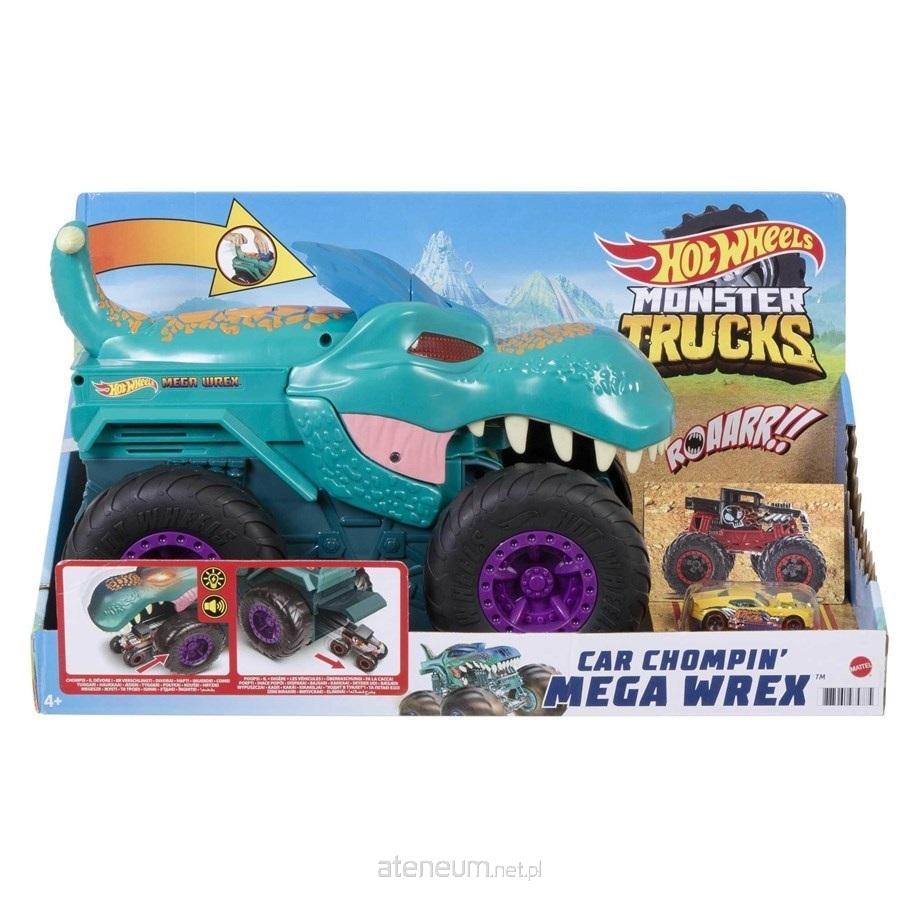 Ten wielki, niezwykły pojazd Pożeracz aut Mega Wrex od Hot Wheels Monster Trucks ma nie tylko światełka i efekty dźwiękowe, ale też wyjątkową funkcję "pożerania" i wypuszczania pojazdów! Naciskaj przycisk na ogonie, aby aktywować efekty dźwiękowe i światła oraz "schrupać" stojące Ci na drodze Monster Trucki i autka w skali 1:64. Groźny Mega Wrex "zjada" pojazdy, a następnie wypuszcza je z tyłu. Fani od 4 roku życia pokochają ten zestaw do zabawy z ulubionym monstrualnym pojazdem! Dołączony jest także jeden metalowy samochodzik Hot Wheels. To wspaniały dodatek do Twojej kolekcji Monster Trucks zapewniający mnóstwo zabawy pełnej emocji.