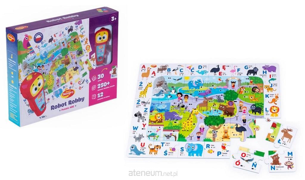 Razem z mówiącym Robotem Robby odkrywaj literki i łącz je z obrazkami! Najpierw ułóż puzzle, a następnie, z pomocą robocika, naciskaj na aktywne pola, słuchając jego dźwiękowych zagadek. Na maluchy czeka aż 250 dźwięków, 63 aktywne pola i 9 trybów gry, a wśród nich rozpoznawanie zwierzątek, szukanie literki, łączenie zwierzaków w pary i odtwarzanie sekwencji. Aktywne pola oznaczone są kodem kreskowym. Aby robot prawidłowo odczytał dane pole, należy delikatnie przycisnąć końcówkę robota do kodu kreskowego, umieszczając robota pionowo nad polem
