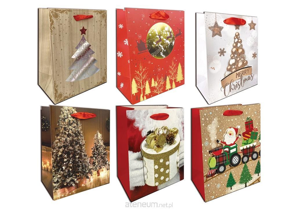 Torebka prezentowa ze świąteczną grafiką. Gramatura papieru 210, torebka laminowana folią mat z dodatkowym uszlachetnieniem (typu brokat/złocenie/srebrzenie/efekt 3D). Wielkość: 180x230x100 mm (S)