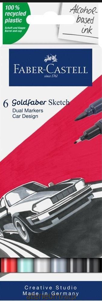 Zestaw tematyczny pisaków dwustronnych Goldfaber Sketch Faber-Castell 6 szt. - car design. Doskonałe dla artystów i hobbystów, zachwycają wszechstronnością zastosowania. Zapewniają łatwe blendowanie bez smug i tworzenie idealnych przejść kolorystycznych. Posiadają dwie końcówki: miękką, elastyczną końcówkę pędzelkową do zadań artystycznych i cienką końcówkę 0,6 mm do konturów i detali. Z szybkoschnącym i permanentnym tuszem na bazie alkoholu. Zatyczki i korpus są wykonane w 100% z materiału pochodzącego z recyklingu, w związku z czym mogą pojawić się niewielkie różnice kolorystyczne. Neutralne pod względem emisji dwutlenku węgla produkcja.