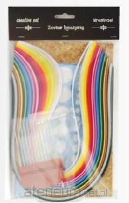 Zestaw zawiera szablon do quillingu wielkości 21x10,5 cm z 27 otworami kołowymi o średnicach 2-40 mm, podkład korkowy do quillingu wielkości 25x15,5 cm , nawijak metalowy do quillingu , grzebień do quillingu , 280 pasków do quillingu w 28 kolorach, specjalną nakładkę do quillingu oraz kolorową instrukcję w języku polskim