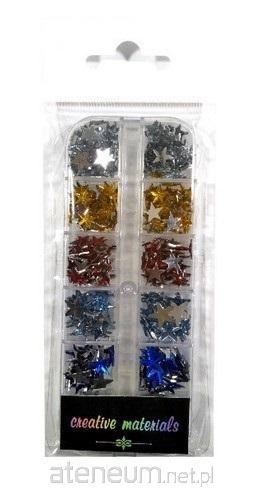 Kryształki z płaskim spodem wykonane z przezroczystego tworzywa sztucznego w kształcie gwiazdki. Spód srebrny metalizowany. Opakowanie z eurozawieszką zawiera miks elementów wielkości 8 mm w 12 różnych kolorach umieszczone w plastikowym pojemniku z 12 przegródkami.