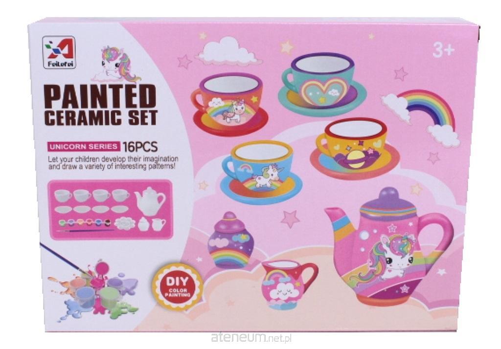 Kreatywny zestaw porcelanowych naczyń dla dzieci. Teraz dzieci będą mogły stworzyć zestaw w kolorach w jakich tylko będą chciały. W zestawie znajduje się: czajnik do herbaty, cukierniczka, mlecznik, 4 filiżanki i 4 talerze, a także pędzel i 6 kolorów farbek. Zabawka dla dzieci od 3 lat. Produkt zapakowany w kartonowe opakowanie. Podane wymiary są wymiarami opakowania