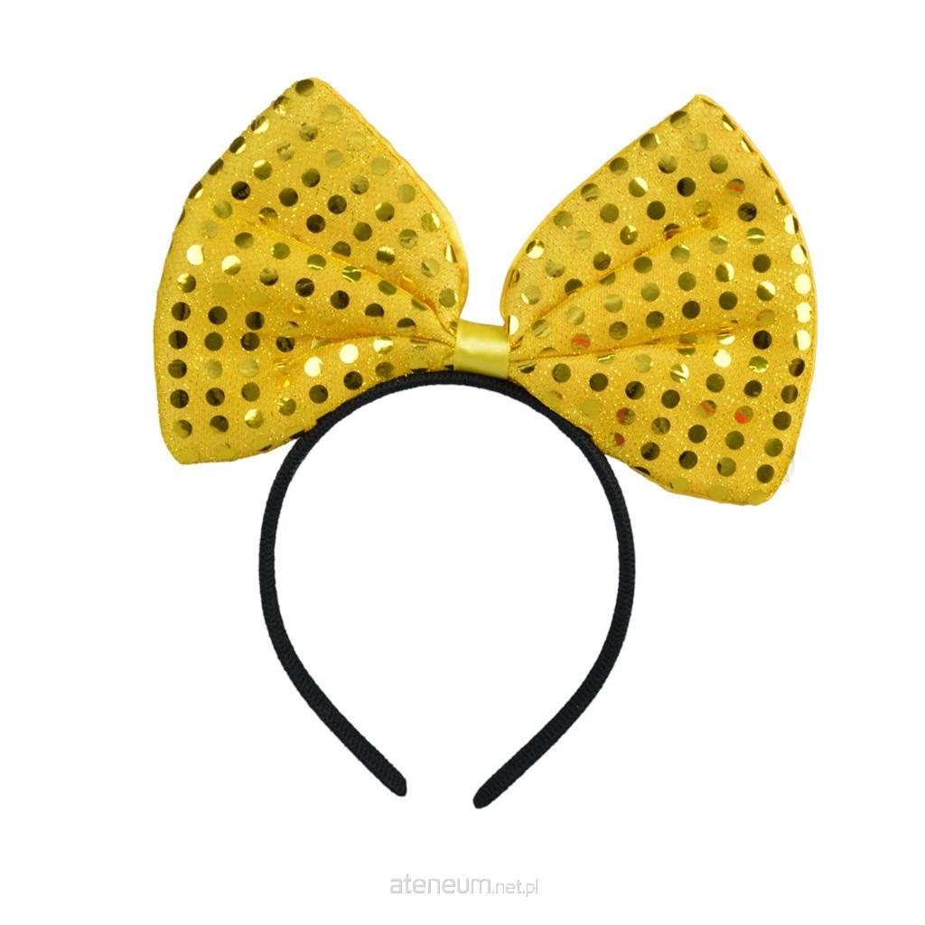 Żółta kokarda na opasce. Zdobiona jest połyskującymi kropeczkami. Idealne dopełnienie stroju na imprezę urodzinową, wieczór panieński lub zabawę karnawałową. Opaska wygodna w użytkowaniu, rozmiar uniwersalny. Rozmiar kokardy: 20 cm.