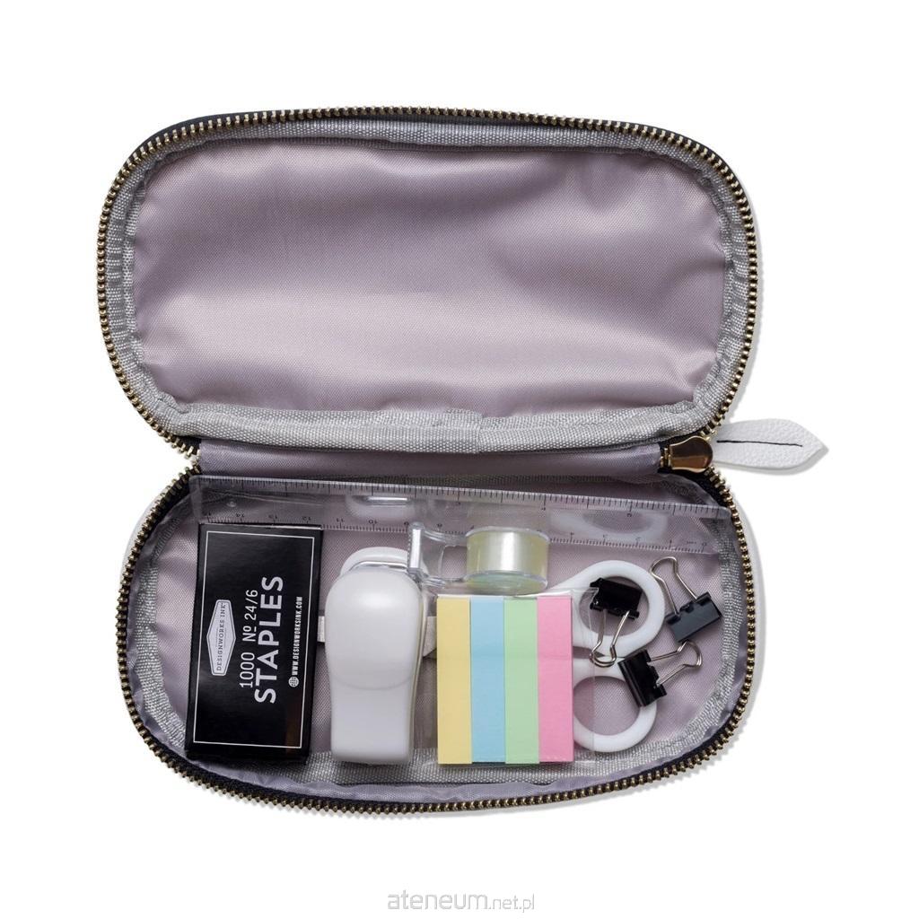 Zestaw zawiera linijkę, mini zszywacz, małe pudełko zapasowe zszywek, mini dyspenser do taśmy, nożyczki, spinacze do segregatorów i znaczniki do stron, a wszystko to zapakowane w miękkie, designerskie etui z wegańskiej skóry. Dodatkowo pokrowiec posiada elastyczną opaskę, która może pomieścić telefon, więc teraz naprawdę masz wszystko, czego potrzebujesz.