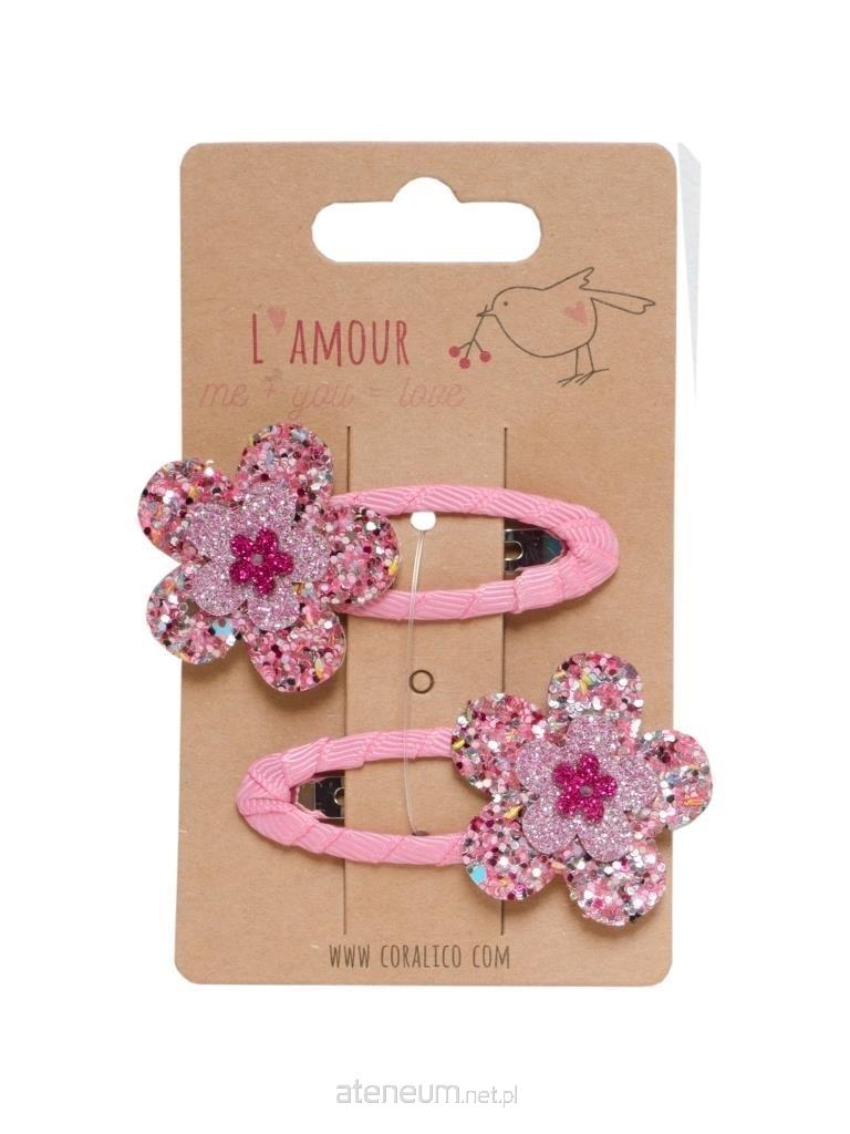 Zestaw spinek z brokatowym kwiatkiem w kolorze różowym.