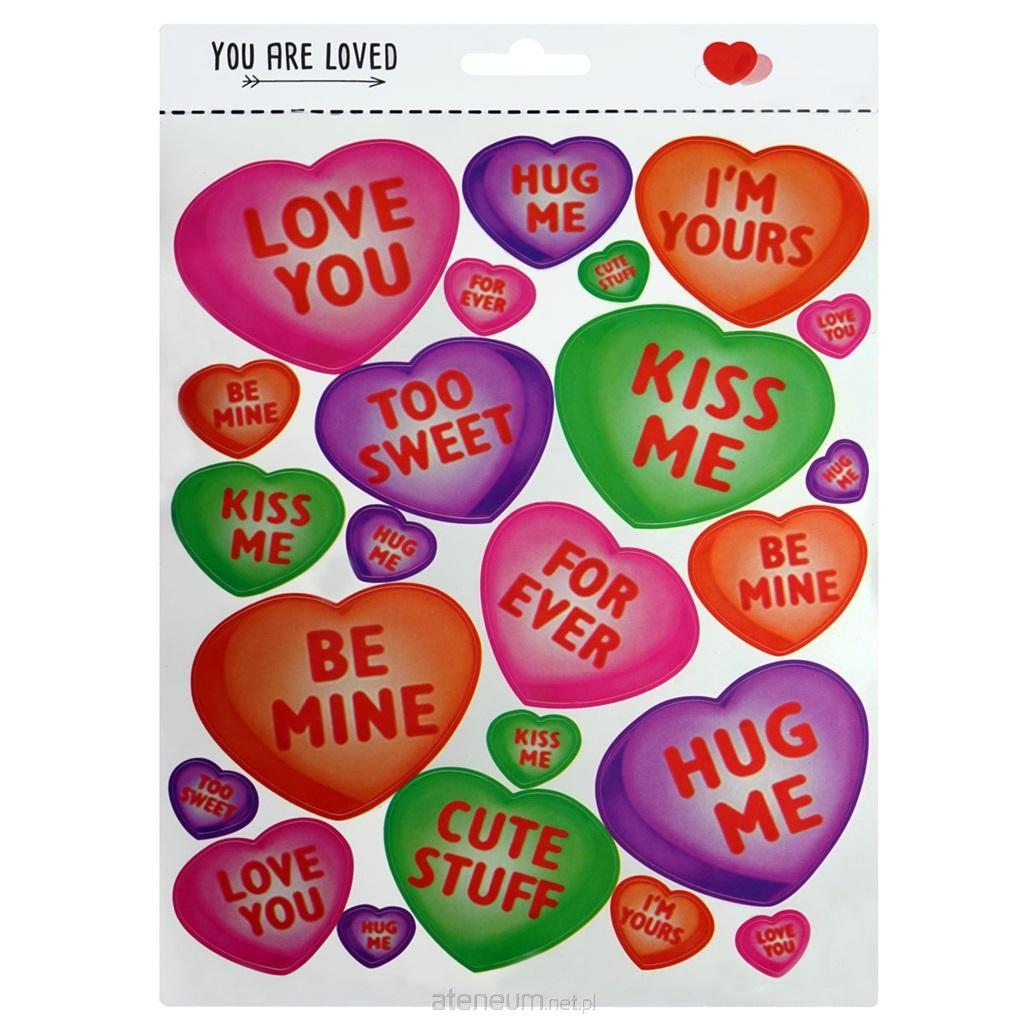 Naklejki w kształcie serduszek z napisami ""love you"" ""kiss me"" itp. Naklejki walentynkowe, idealne do dekoracji upominków, kartek z okazji walentynek. Mix rozmiarów i kolorów na blistrze. Blister o wymiarze: 22x28 cm