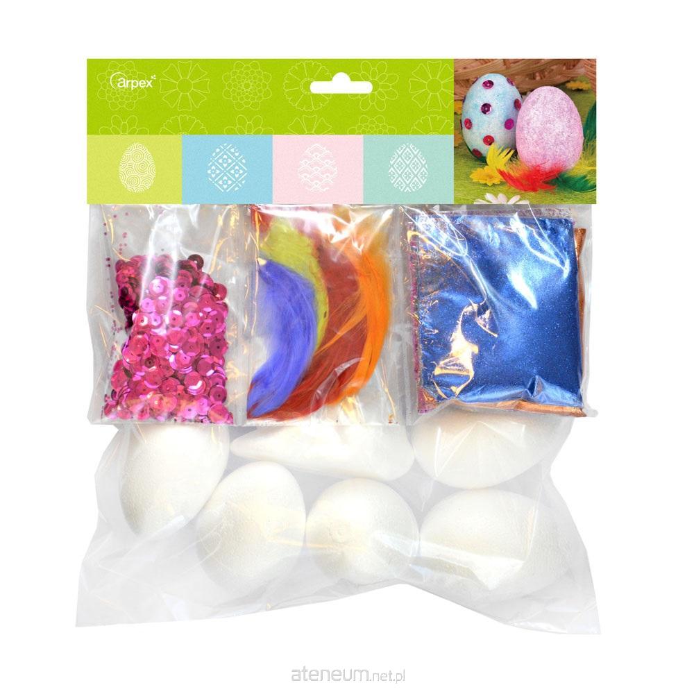 Zestaw zawiera: 5 jaj styropianowych 7 cm, 1 zająca styropianowego, brokat sypki w różnych kolorach, piórka i cekiny dekoracyjne.