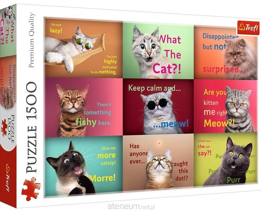 Puzzle Zabawne kocie portrety składają się z 1500 elementów i przedstawiają śmieszne memy z kotami w rolach głównych. Po ich ułożeniu powstanie obrazek o wymiarach 850x580 mm.