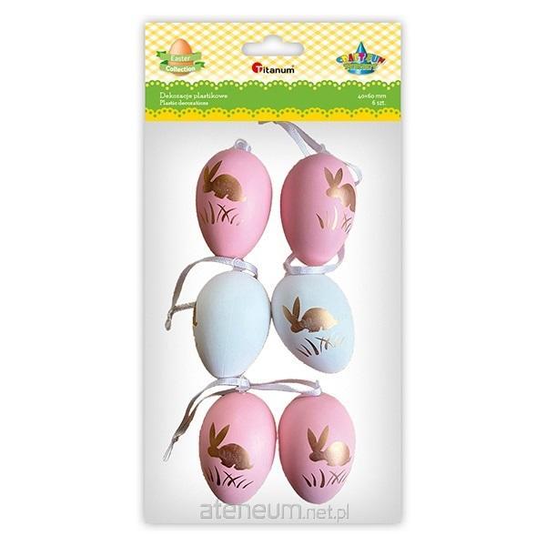 Zawieszki plastikowe jajka 40 x 60 mm białe, różowe ze złotym nadrukiem króliczka i trawy 6 szt.