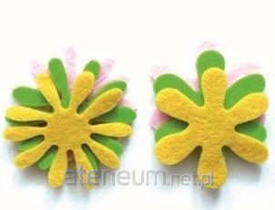 Opakowanie zawiera 6 stokrotek z filcu w dwóch kształtach w kolorach: żółtym, zielonym i jasno różowym.