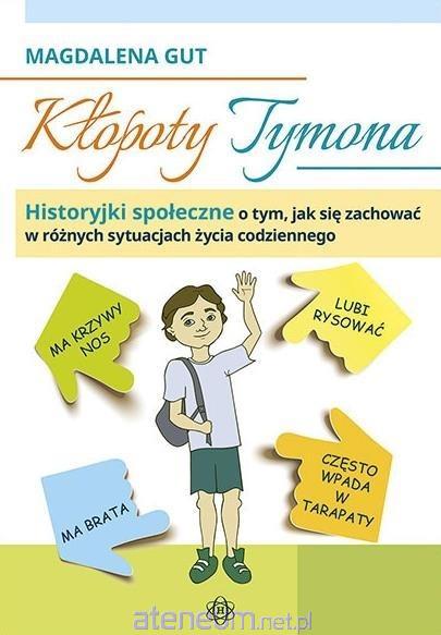 Kłopoty Tymona to publikacja skierowana zarówno do rodziców, jak i nauczycieli oraz terapeutów pracujących z osobami z zaburzeniami ze spektrum autyzmu. Może być również wykorzystana na zajęciach z dziećmi prawidłowo rozwijającymi się (np. na lekcji o prawidłowym zachowaniu). Ma pomóc w dostrzeganiu błędów i wzbudzić refleksję, jak powinno się zachowywać, by ich uniknąć. Historyjki można podzielić na trzy kategorie dom, szkołę i miasto. W każdej części znajduje się siedem opowiadań, w których tytułowy Tymon popełnił błąd mający swoje konsekwencje w reakcji otoczenia. Zadaniem osoby zapoznającej się z tekstem jest odpowiedzenie na dwa rodzaje pytań:1) sprawdzających zrozumienie tekstu i 2) sprawdzających zrozumienie sytuacji. Pytania z pierwszej grupy mają na celu sprawdzenie, czy uczeń zapoznał się z treścią historii. Następnie dzieci odpowiadają na pytanie, jak Tymon mógł postąpić, by uniknąć kłopotów. Na koniec zapoznają się z przykładowym rozwiązaniem i porównują je ze swoją odpowiedzią.