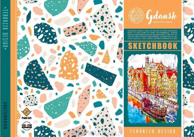 Szkicownik w twardej oprawie. Zawiera 36 kartek o gramaturze 100g/m2. Na okładce znajduje się motyw Gdańska. Wyprodukowano na Ukrainie.