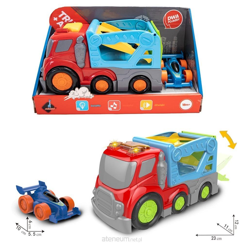 Zestaw autek 2w1 Laweta i mini wyścigówka Laweta z napędem friction (23x11x12 cm) Mini wyścigówka (10x5.5x6 cm) Efekty świetlne i dźwiękowe