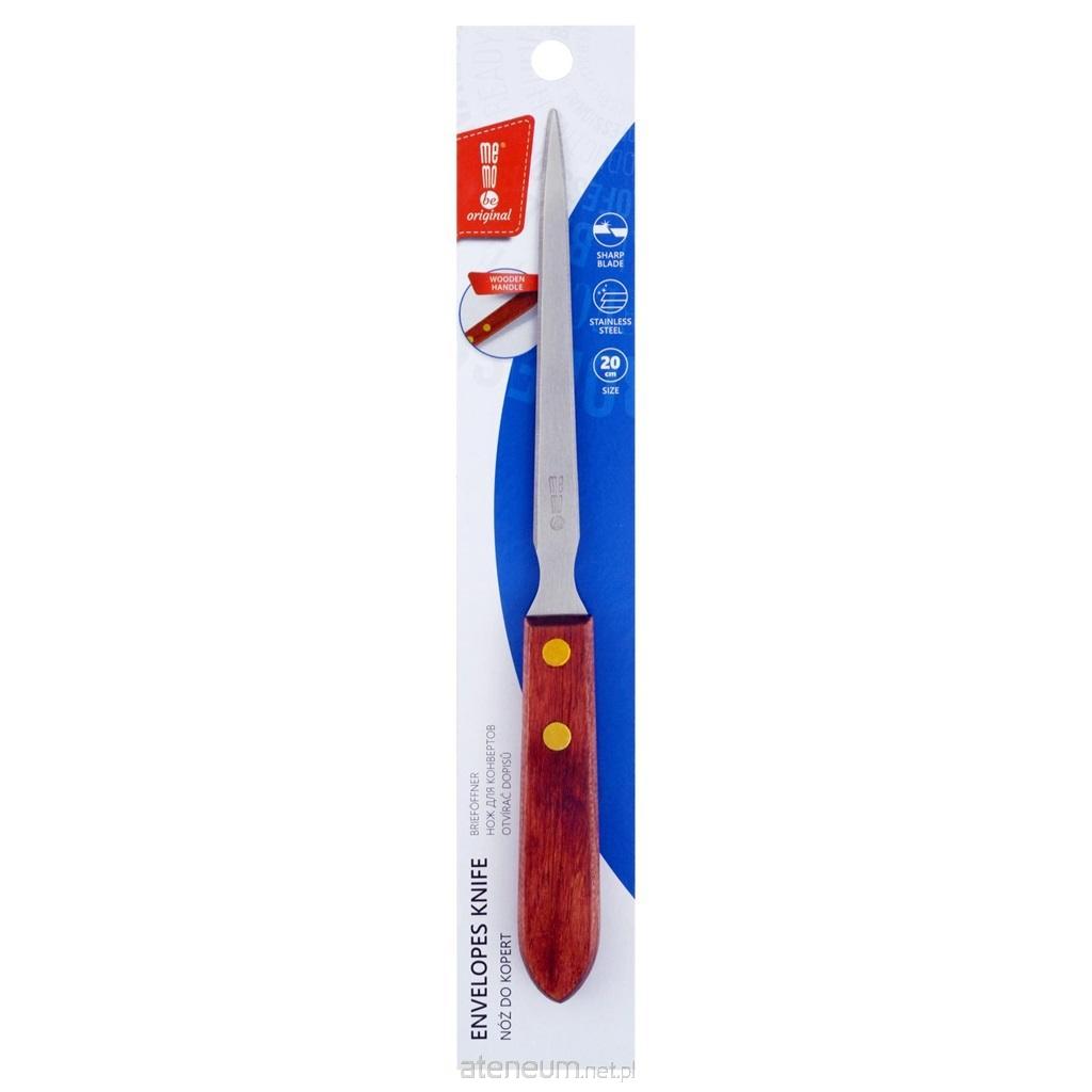 Nóż do kopert MemoBe. Stal nierdzewna z drewnianym uchwytem. Eleganckie trwałe mocowanie uchwytu. Długość całkowita to 20cm, w tym ostrze o długości 11,5cm. Każdy nóż znajduje się na blistrze ze specjalną osłonką, która zapobiega przypadkowym otarciom wewnątrz zbiorczego pudełka.