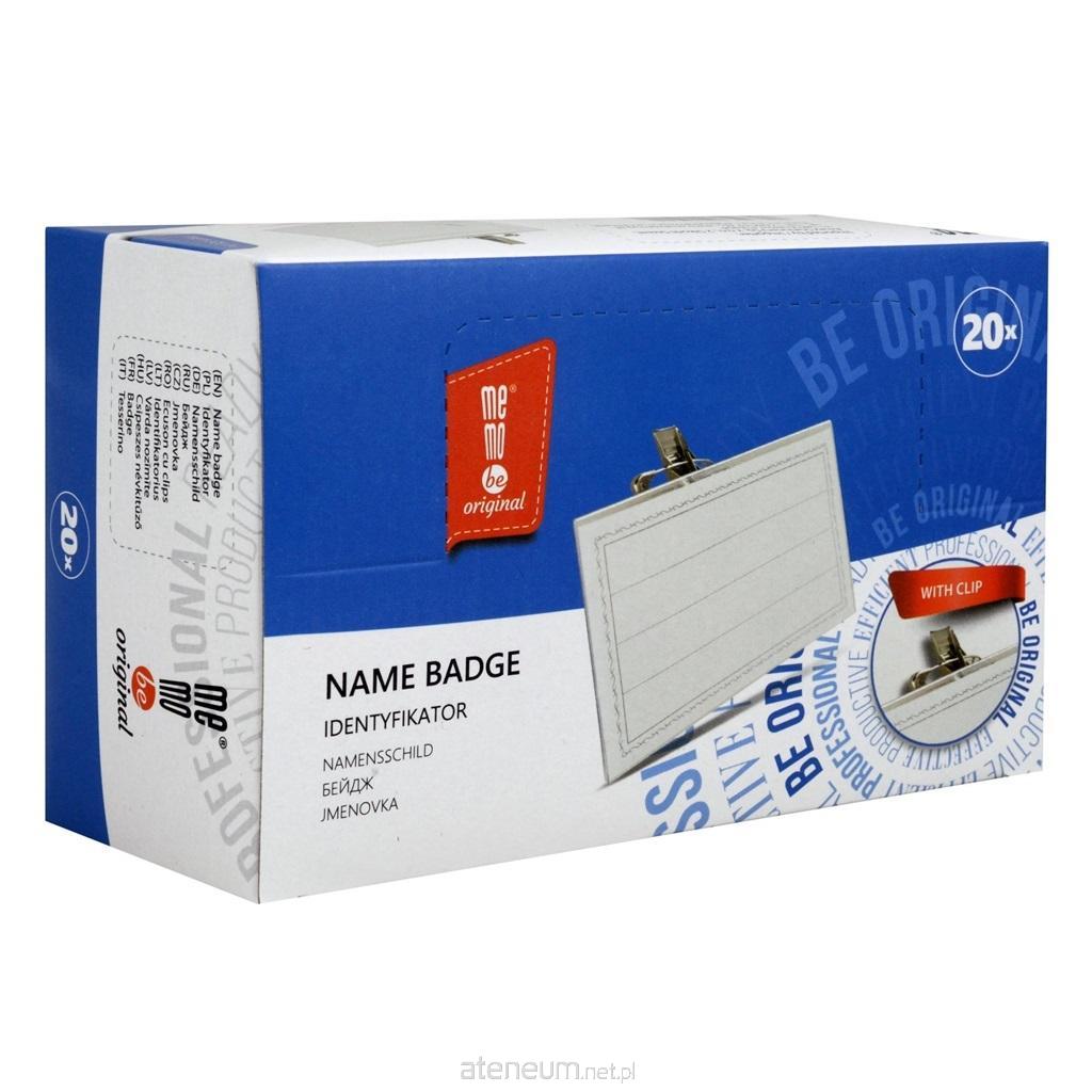 Identyfikator MemoBe z przezroczystego, sztywnego tworzywa . Wyposażony w klips sprężynujący i niewielką agrafkę . Posiada nadrukowane linie z przodu i kod kreskowy na odwrocie . Wymiary: 87x53mm.