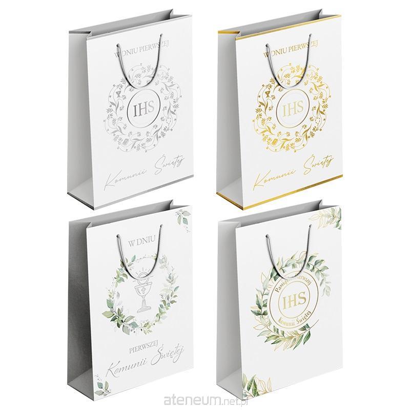 Torby prezentowe bogato ozdobione srebrną lub złotą folią. Gruby papier o dużej sztywności gramatura 210 g/m. Miks 4 wzorów wysyłany losowo