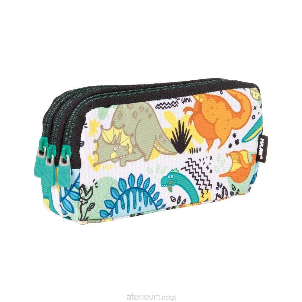 Piórnik saszetka MILAN z 3 szerokimi przegródkami ułatwiającymi organizację zawartości. Specjalna kolekcja Dinos, w której głównymi bohaterami są przyjazne dinozaury żyjące wśród kolorowej roślinności. Nadruk w jasnych kolorach: zielonym, niebieskim, pomarańczowym i żółtym na białym materiale. Zamek błyskawiczny i detale w kolorze czarnym. Skład: zewnętrzny i wewnętrzny 100% poliester. Wymiary: 22 x 11 x 6,5 cm.
