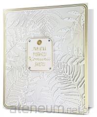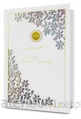 Składany z trzech stron kwadratowy karnet o wymiarach 15 x 15 cm z wyciętym elementem na froncie. Złocony i tłoczony, teksy życzeń w środku. Wydrukowany na wysokiej jakości papierze. W zestawie koperta.