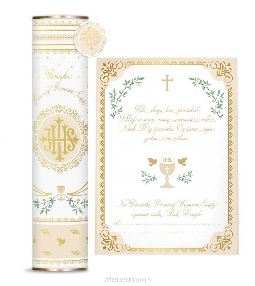 Tuba Komunijna, wysokość 25cm,średnica 5 cm. Bogato złocona, zamykana stalowymi złotymi wieczkami. W komplecie kartka z życzeniami A4 z obwolutą i bilecikiem. Całość zapakowana w worek foliowy z wstążką i przywieszką.