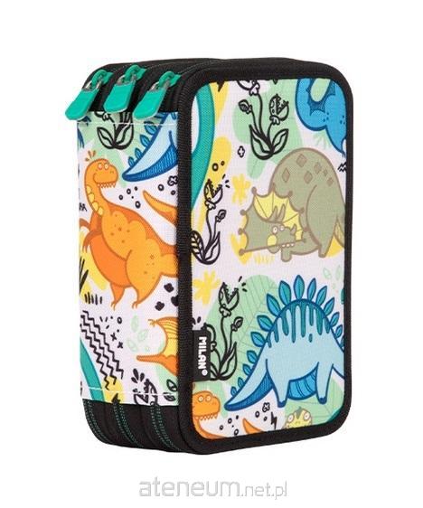 Piórnik 3 - poziomowy z wyposażeniem, który pozwala utrzymać przybory szkolne zawsze w porządku i łatwo dostępne. Specjalna kolekcja Dinos, w której głównymi bohaterami są przyjazne dinozaury żyjące wśród kolorowej roślinności. Nadruk w jasnych kolorach: zielonym, niebieskim, pomarańczowym i żółtym na białym materiale. Zamek błyskawiczny i detale w kolorze czarnym. Wyposażenie: 12 kredek trójkątnych, 6 kredek metalizowanych, 18 flamastrów ze stożkową końcówką, 3 długopisy P1: czarny, czerwony i niebieski; ołówek sześciokątny HB, 5 zakreślaczy, linijka trójkątna 15 cm, temperówka kwadratowa AFILA, nożyczki BASIC, gumka 4024. Każdy poziom osobno zapinany na suwak. Przy produkcji piórników użyto najlepszych materiałów, bardzo wytrzymałych suwaków oraz wzmocnionych nici. Niepowtarzalne wzornictwo. Skład: Materiał zewnętrzny i wewnętrzny 100% poliester. Rozmiar piórnika: 19,5 x 13 x 7,5 cm. W piórnikach znajdziesz min.: kredki MILAN przy produkcji których użyto drewna pochodzącego wyłącznie z plantacji, gwarantujących nieużywanie drewna z lasów deszczowych. Rysik kredki na całej długości jest przyklejony do drewna co zapobiega jego łamaniu. Dzięki trójkątnej budowie kredka jest ergonomiczna i wygodnie trzyma się dziecku. Flamastry MILAN posiadają wytrzymałą i elastyczną stożkową końcówką, która nie wpada do środka nawet przy silnym nacisku. Po chwilowym odkształceniu końcówka zawsze wraca do pierwotnego kształtu. Tusz na bazie wody. Flamastry nie zawierają ftalanów, metali ciężkich i innych. Temperówkę z bezpiecznym przykręconym ostrzem dzięki czemu ostrze nie oddzieli się od obudowy temperówki. Gumkę z naturalnym kauczukiem.