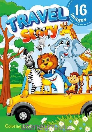 Kolorowanka dla dzieci. Na każdym z 16 obrazków znajduje się obrazek związany z podróżami, który tylko czeka żeby nabrać kolorów. Wyprodukowana na Ukrainie.