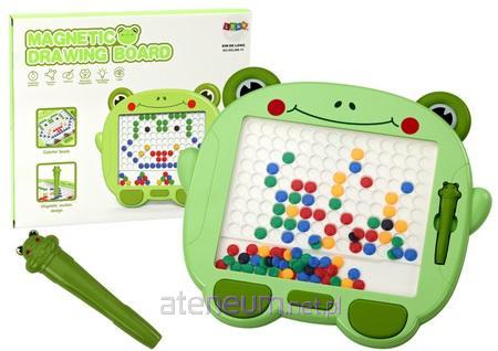 Tablica Magnetyczna Edukacyjna Żabka Rysik Pad Układanka Zielona Koraliki Tablica magnetyczna w kształcie uroczej żabki to doskonała zabawka dla dzieci, która zachęca do kreatywności i rozwija zdolności manualne. Tablica ma intensywnie zielony kolor, który od razu przyciąga uwagę małych odkrywców. Głównym elementem tablicy jest duża biała plansza z wypustkami, która jest idealnym podłożem do układania koralików magnetycznych. Te koraliki, dostępne w różnych kolorach - czarnym, niebieskim, żółtym, czerwonym i zielonym - mogą być używane do tworzenia różnorodnych wzorów i obrazków. Przez przezroczystą ściankę, która chroni rysunek przed przypadkowym zniszczeniem, dzieci mogą swobodnie aranżować swoje kompozycje za pomocą specjalnego rysika magnetycznego z motywem żabki. Najlepszą częścią zabawy jest to, że gdy dzieło zostanie ukończone lub chcemy zacząć od nowa, wystarczy delikatnie potrząsnąć tablicą, a koraliki automatycznie znikną, gotowe do ponownego wykorzystania. Ta interaktywna tablica magnetyczna nie tylko zapewnia godziny rozrywki, ale także rozwija zdolności twórcze i koordynację ruchową u dzieci, sprawiając, że nauka staje się przyjemnością. Wymiary tablicy: 32 cm x 27 cm x 2 cm Wymiary opakowania: 33 cm x 29 cm x 3 cm Posiada certyfikat CE, ponadto jest zgodny z normą EN71. Przeznaczony dla dzieci powyżej 3 roku życia