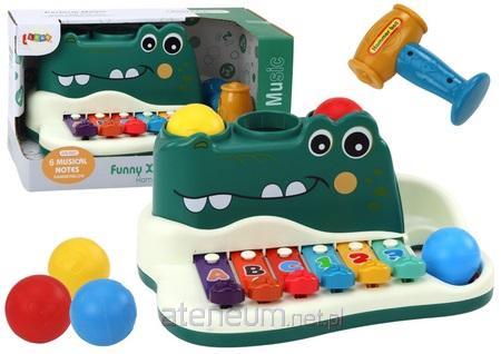 Cymbałki Pianinko Krokodyl Organki Młoteczek Piłeczki Instrument Edukacyjny Cymbałki z motywem krokodyla to nie tylko instrument muzyczny, ale również interaktywna zabawka, która zachęca dzieci do eksploracji dźwięków i rozwijania umiejętności poznawczych. Krokodyl, wykonany z zielonego tworzywa, posiada duże białe oczy i ostre zęby, co nadaje mu charakterystyczny wygląd i sprawia, że jest atrakcyjny dla dzieci. Zabawa polega na uderzaniu młoteczkiem w kolorowe cymbałki umieszczone na grzbiecie krokodyla lub wbijaniu piłeczek poprzez otwory, co powoduje wydobycie dźwięków z cymbałek. Dodatkowo, gdy piłeczki uderzają w cymbałki, wybijają dodatkowe nutki, co dodaje elementu interaktywnego i zachęca do eksploracji dźwięków. Na klawiszach cymbałek widnieją namalowane cyferki i literki, co pozwala dziecku dodatkowo zapamiętywać kolejność uderzania i stymuluje rozwój umiejętności poznawczych. Dzieci mogą grać na kolorowych cymbałkach za pomocą dołączonego młoteczka lub palców, co pozwala na różnorodność w zabawie i rozwija zdolności motoryczne. Zabawka nie tylko dostarcza radości z eksploracji dźwięków, ale również pomaga w nauce rozpoznawania pierwszych liter i cyfr, co czyni ją doskonałym narzędziem edukacyjnym dla najmłodszych dzieci. Wymiary instrumentu: 28 cm x 14 cm x 16 cm Wymiary opakowania: 30 cm x 19 cm x 16 cm Posiada certyfikat CE, ponadto jest zgodny z normą EN71. Zabawka przeznaczona jest dla dzieci powyżej 3 roku życia.