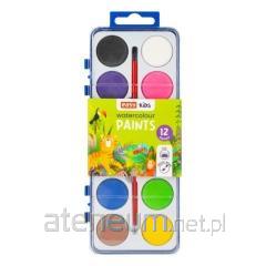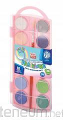 Farby akwarelowe Cricco pastelowe w 12 delikatnych kolorach. Krążki farb zamknięte w plastikowej kasetce z zawieszką oraz z pędzelkiem dołączonym do zestawu. Kolory można mieszać ze sobą, tworząc nowe odcienie. Mogą stanowić uzupełnienie do podstawowych kolorów farb akwarelowych lub plakatowych.