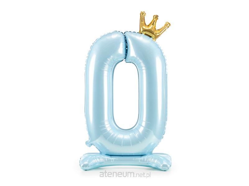 Stojący, metalizowany balon foliowy cyfra "0" w kolorze błękitnym z koroną w kolorze złotym, rozmiar przed napompowaniem 103 cm (40.5''), rozmiar po napompowaniu 84 cm (33''). Do napompowania powietrzem.
