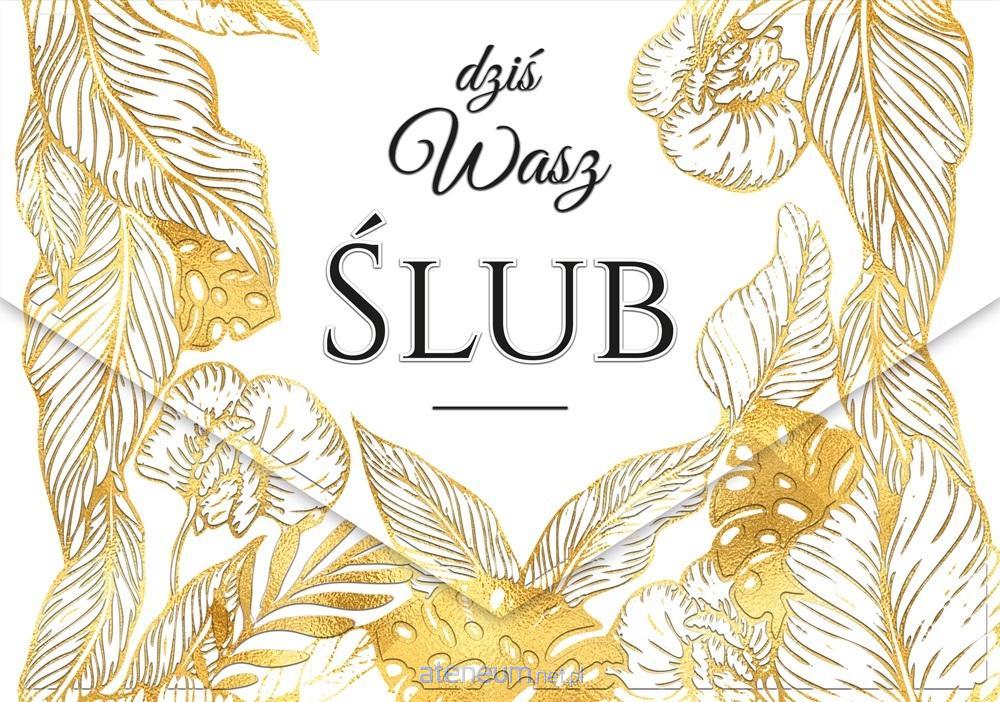 Karnet z kieszonką na pieniądze w formacie A5, składany z trzech. Złocony i tłoczony, teksy życzeń w środku. Wydrukowany na wysokiej jakości papierze. W zestawie koperta.