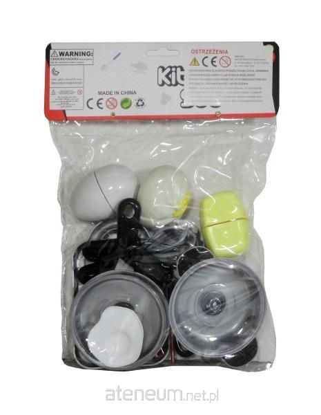 Zestaw kolorowych naczyń i akcesoriów kuchennych dla małej gospodyni domowej, przydatne podczas zabawy w dom. W zestawie można znaleźć m. in.: garnek i rondlelek z pokrywkami, a także akcesoria kuchenne np.: nóż, chochla, trzepaczka. Ponadto w zestawie znajduje się kilka produktów spożywczych jak: jajko, ser, cebula. Produkt zapakowany w przezrczysty worek. Produkt dla dzieci od 3 lat. Podane wymiary są wymiarami opakowania.