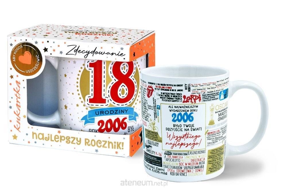 Kubek Premium "Urodziny 18" Q 998 Kubki Premium Kukartka z serii Roczniki to idealny pomysł na prezent - wzory są oryginalne, zdobione złotem i pakowane w piękne pudełeczko. Na kubkach znajdują się ciekawe wydarzenia z danego roku. *OPAKOWANIA WYSTĘPUJĄ W RÓŻNYCH KOLORACH: CZARNY, NIEBIESKI, GRANATOWY, RÓŻOWY, BIAŁY I MIĘTOWY. KOLORY OPAKOWAŃ SĄ WYBIERANE LOSOWO. Cechy szczególne: Typ produktu: kubek na prezent, Materiał: porcelana, Pojemność: 300ml Opakowanie: ozdobny kartonik, Okazja: 18 urodziny
