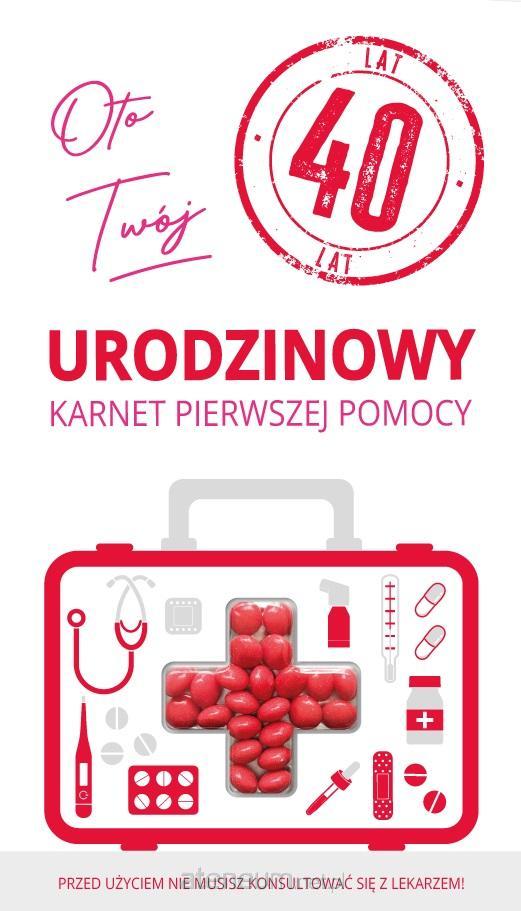 Karnet z okazji 40 urodzin z życzeniami, kopertą i humorystycznym dodatkiem w środku.