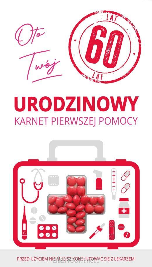 karnet z okazji 60 urodzin z życzeniami, kopertą i humorystycznym dodatkiem w środku.