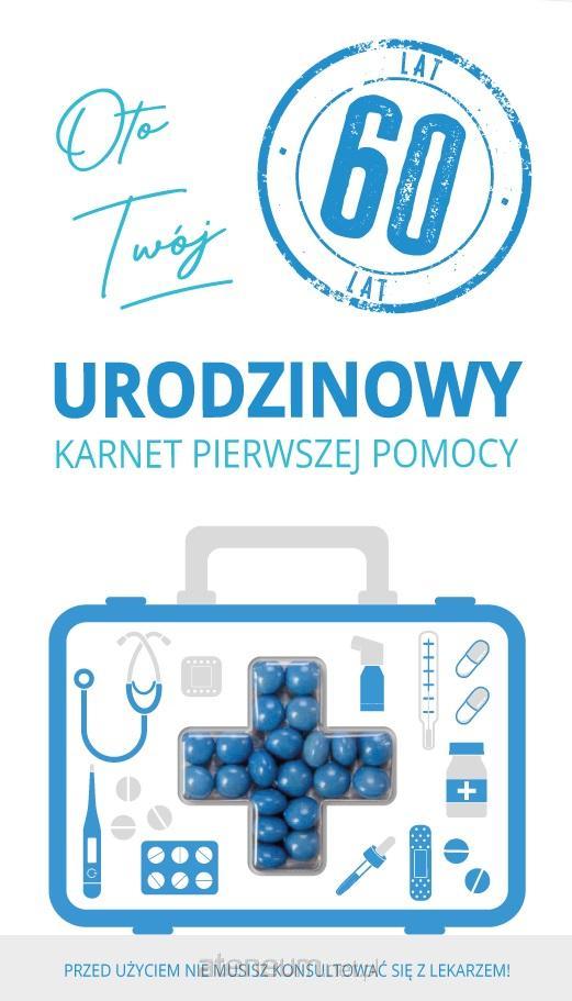 Karnet z okazji 60 urodzin z życzeniami, kopertą i humorystycznym dodtakiem w środku.