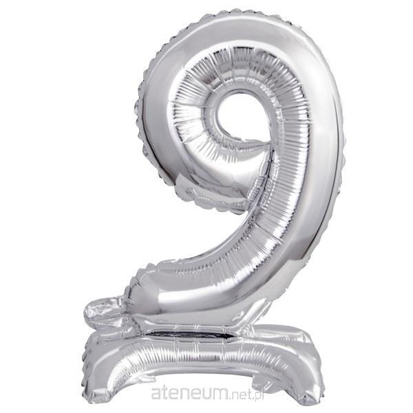 Mini cyfra 9 na stojaku srebrny balon foliowy zapakowany 22 cm x 40 cm