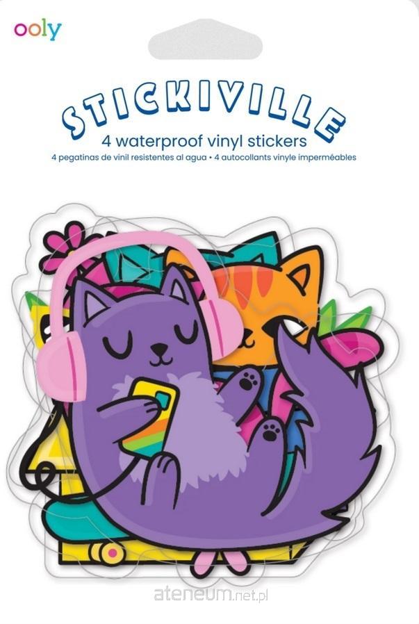 Naklejki przedstawiają śmieszne koty w różnych miejscach: na deskorolce, w pudełku, w doniczce i słuchające muzyki