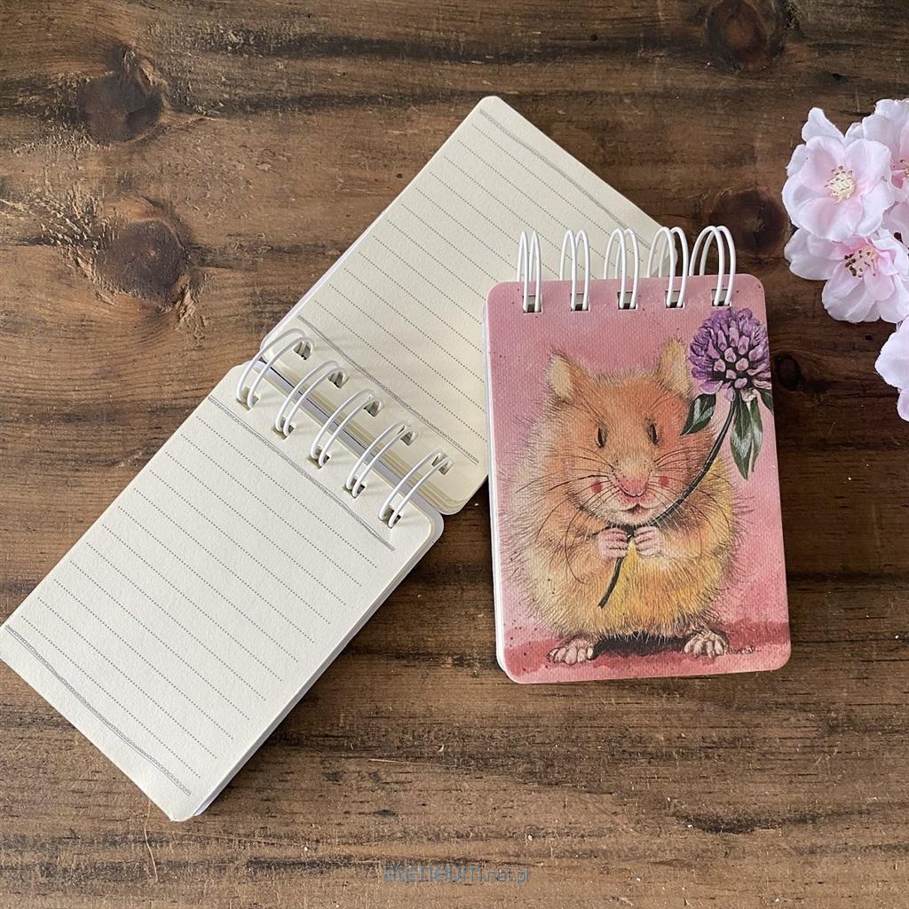 Ozdobny kołonotatnik w formacie A7 z twardą okładką, otwierany do góry. W środku znajduje się 112 stron w linie. Z tyłu zawiera małą, plastikową kieszeń, w której można przechowywać dodatkowe notatki, paragony itp.
