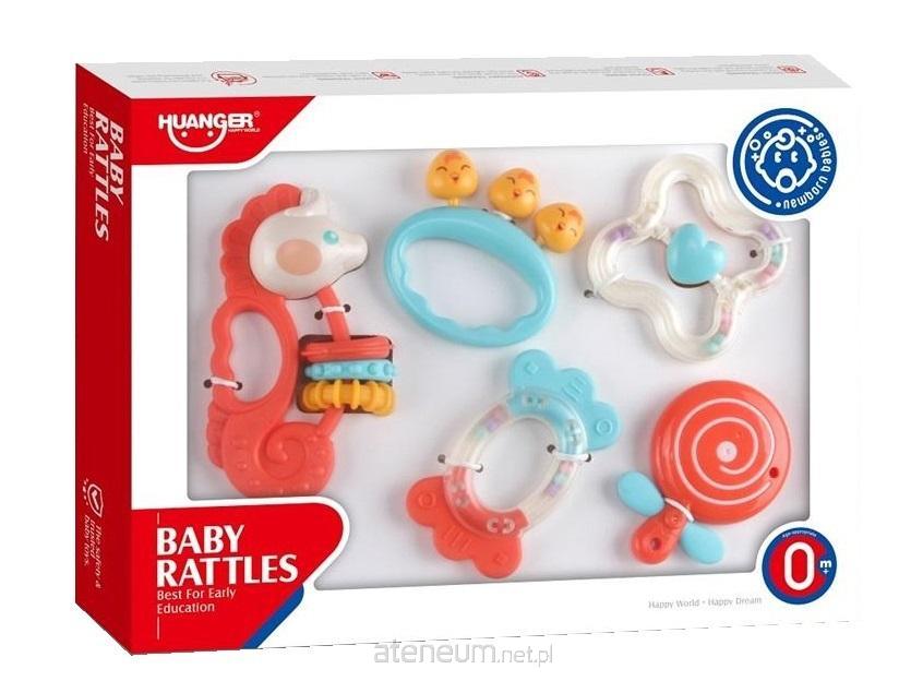 zestaw 5 grzechotek - gryzaków dla najmłodszych , elementy są wykonane z silikonu i plastiku.