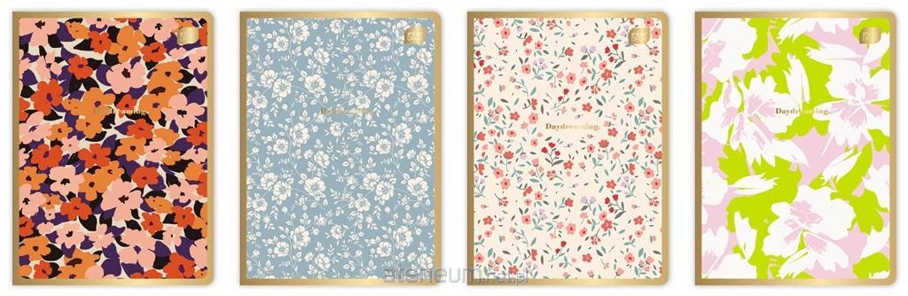 Format: A5. Liczba kartek: 60. Zadruk w kratkę. Zaokrąglone rogi. Piękne, kwiatowe okładki z efektem satynowej metalizy.