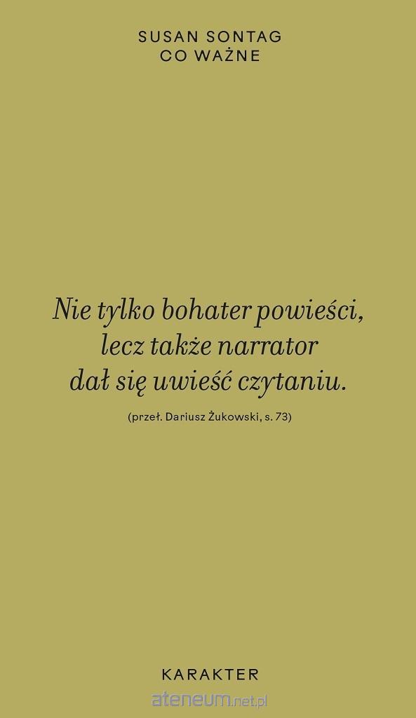 Co ważne Nietłumaczony dotąd na język polski ostatni tom esejów, który ukazał się za życia amerykańskiej intelektualistki. Teksty powstałe w latach 1982-2001 dotyczą literatury, filmu, teatru, sztuki oraz tańca współczesnego. Sontag porusza się po tych tematach ze znawstwem i dociekliwością. Najwięcej miejsca poświęca literaturze. Przygląda się językowi poezji i prozy, interpretuje dzieła tych, których podziwiała i których zachłannie, choć niebezkrytycznie, czytała (Cwietajewej, Gombrowicza, Sebalda, Walsera, Zagajewskiego, Machado de Assisa, Barthes'a), oraz pisarzy i pisarek, z którymi łączyła ją przyjaźń (Ki czy Hartwick). Poprzez teksty kultury przygląda się nowym trendom, żegna ze światem wielkich narracji (jej ukochane kino!), próbuje zajrzeć pod powierzchnię tego, co polityczne - gdy opisuje wyzwania związane z wystawieniem Czekając na Godota w Sarajewie. By zbadać związki między tym, co rzeczywiste, i tym, co nierzeczywiste, sięga do bunraku, a gdy chce oddać hołd radosnej energii twórczej, przywołuje obrazy Howarda Hodgkina. Z jej zapisków przebija pasja odkrywania i opisywania świata, ale i niepokój o to, co przyniesie przyszłość. "Dziś książki są gatunkiem zagrożonym. Przez książki rozumiem także takie warunki czytania, w których literatura może istnieć i wpływać na duszę" - pisze w datowanym na 1996 rok bardzo osobistym liście do Borgesa.